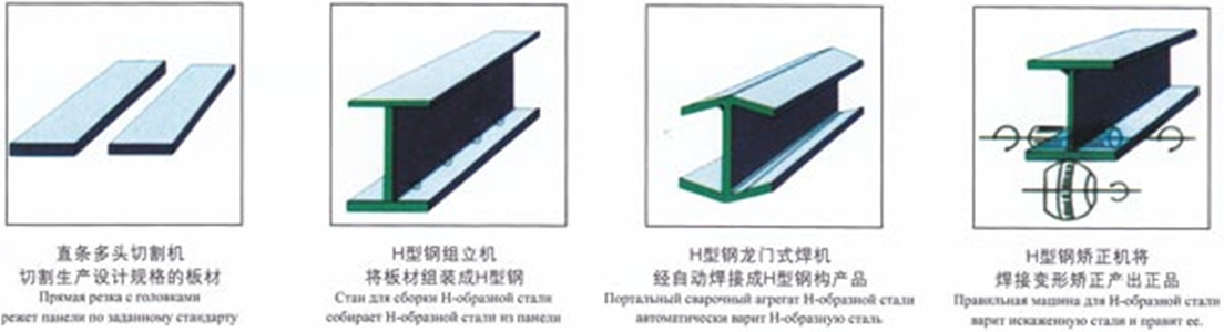 輕型H型鋼的生產(chǎn)工藝過(guò)程為: 直條切割——型鋼組立——龍門(mén)焊接——翼緣板矯正——小件制作及筋板焊接——〔三維鉆孔——拋丸除銹——噴漆涂裝〕。